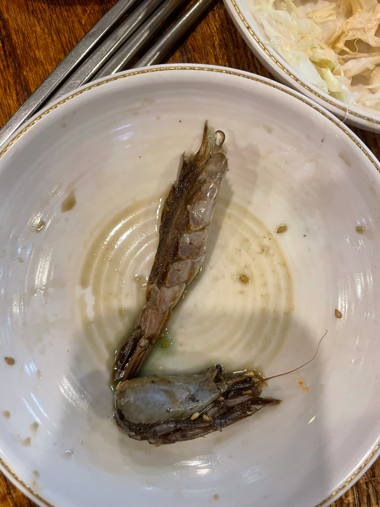 그런데 친구놈이 몇 마리 더 먹더니, "어? 내 새우는 초록 물 하나도 안 나오네" 이러는 겁니다. 정말 친구가 먹은 새우에는 초록 빛이 전혀 없었습니다..