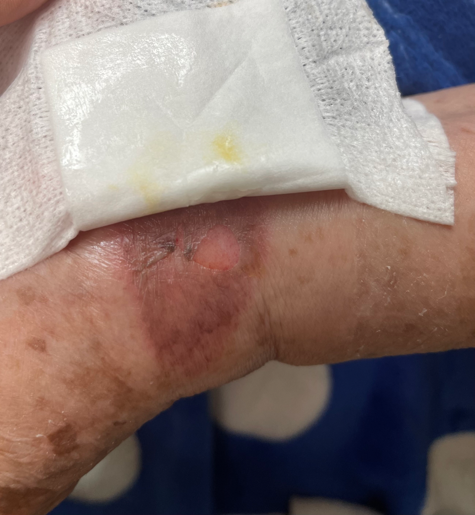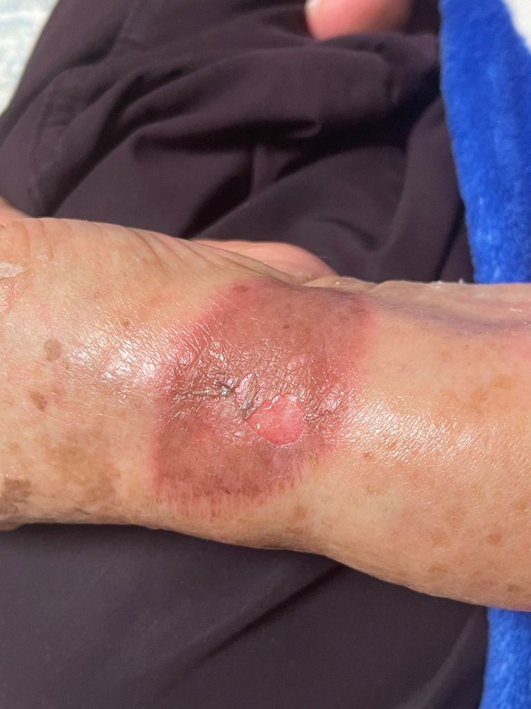 화상은 피부 조직이 손상된 상태입니다. 화상은 1도 화상, 2도 화상, 3도 화상으로 나뉩니다. 1도 화상은 피부 표면이 붉어지고 따끔거리는 증상이 나타납니다. 2도 화상은 피부 표면이 붉어지고 물집이 생깁니다. 3도 화상은 피부 표면이 검게 변하고 괴사합니다. 사진으로 보았을 때, 할머니께서 입은 화상은 2도 화상인 것으로 보입니다. 2도 화상은 시간이 지나면서 껍질이 생기고, 껍질이 떨어지면 새로운 피부가 생깁니다. 2도 화상은 염증이 생기지 않으면 잘 낫습니다. 할머니께서 항생제 알약과 항생제 연고를 사용하고 계신 것으로 보아, 염증이 생기지 않도록 관리하고 계신 것 같습니다. 껍질이 밀려 살이 보이고, 살이 붉어 보이기는 하지만, 이는 정상적인 회복 과정입니다. 껍질이 떨어지고 새로운 피부가 생기면, 붉은 색은 사라질 것입니다. 할머니께서 2도 화상을 입으셨고, 염증이 생기지 않고 잘 낫고 있는 것으로 보입니다. 항생제 알약과 항생제 연고를 계속 사용하고, 껍질이 떨어질 때까지 관리해 주시면 됩니다.