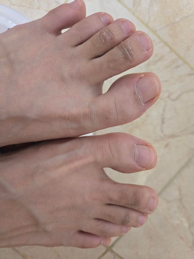 사진처럼 양쪽발 2,3번째 발가락 마디 부분이 검게 되면서 얇게 굳은살 같은게 생겨있습니다.