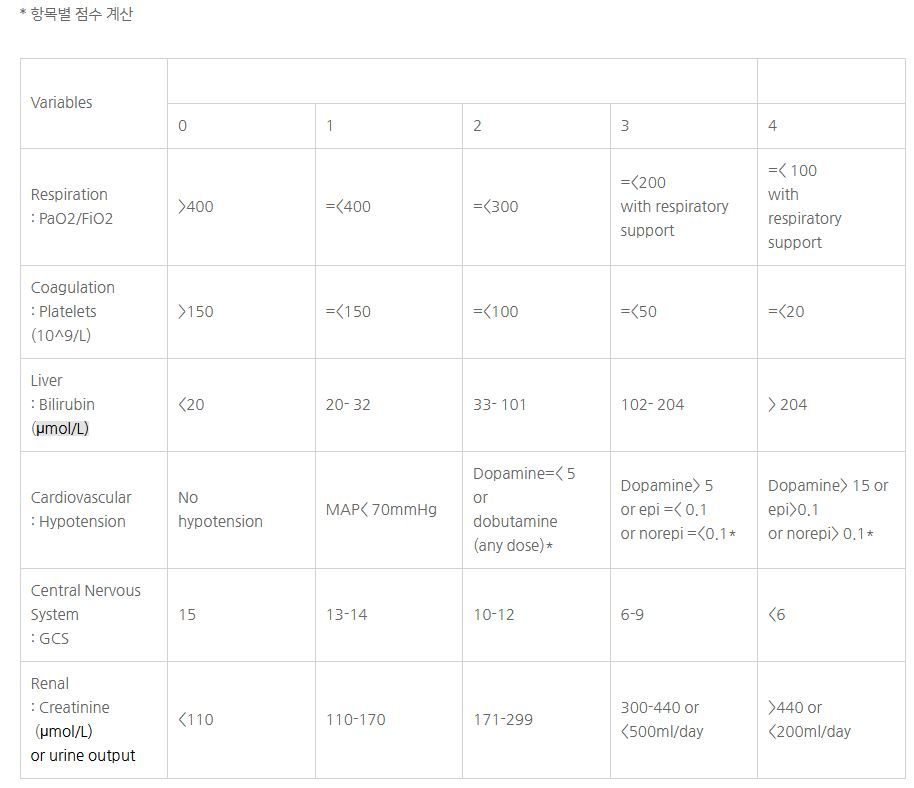 Sequential (Sepsis-related) Organ Failure Assessement (SOFA) Score에 대해 문의드립니다.