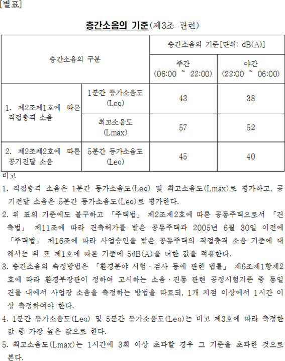 제3조(층간소음의 기준) 공동주택의 입주자 및 사용자는 공동주택에서 발생하는 층간소음을 별표에 따른 기준 이하가 되도록 노력하여야 한다.