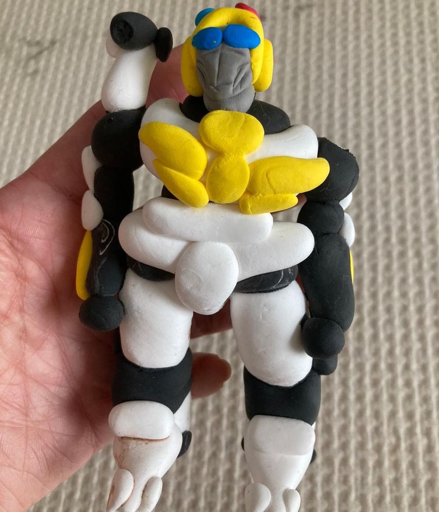 여기 클레이로 만든 합체로봇은 몸에 부품이 하얗고 까맣고, 노란 금속으로 되어 있었어요.