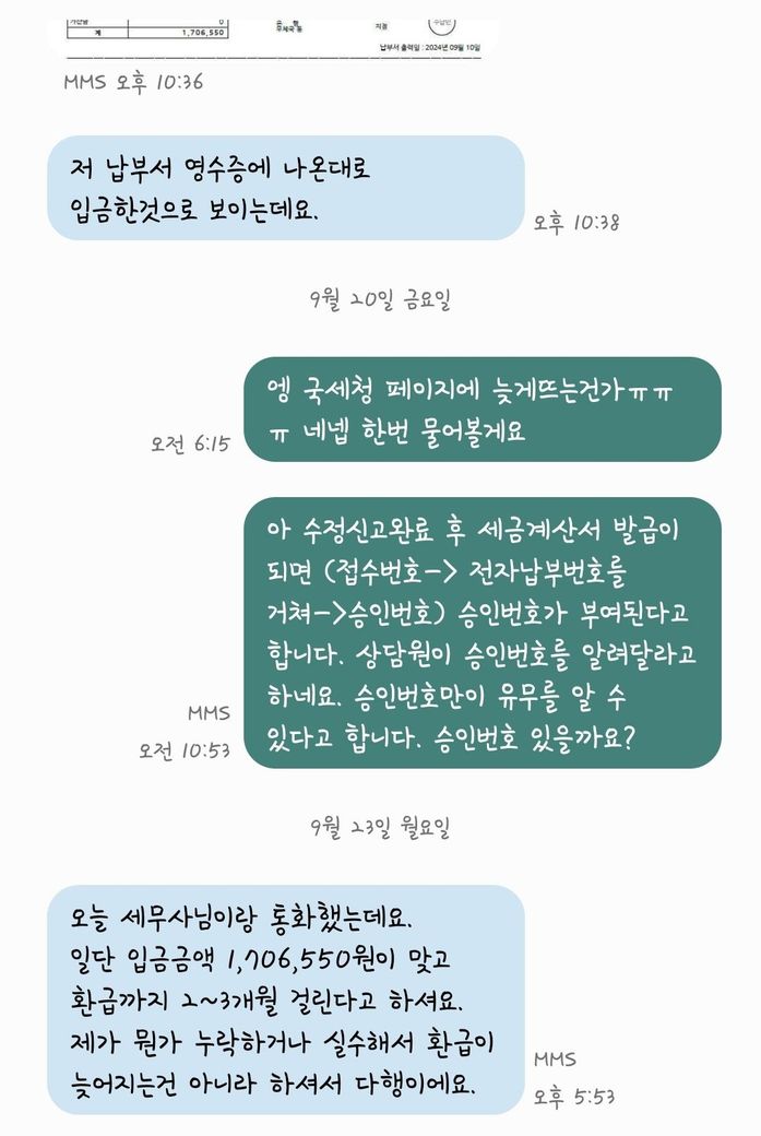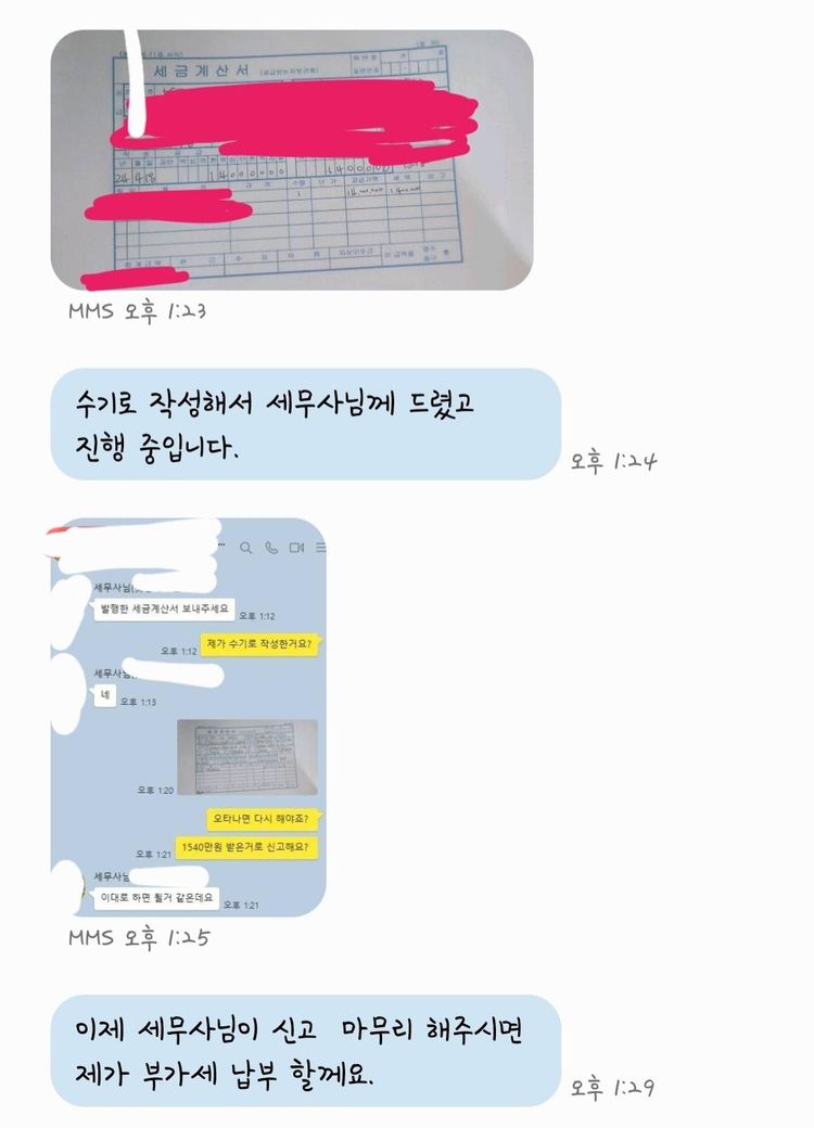 9월쯤 제가 세금계산서 떼달라고 하고 알겠다고 하셔서 제가 140만원 주고 수정세금계산서 떼주신다고 함.