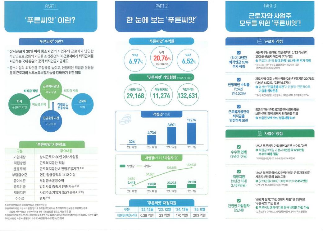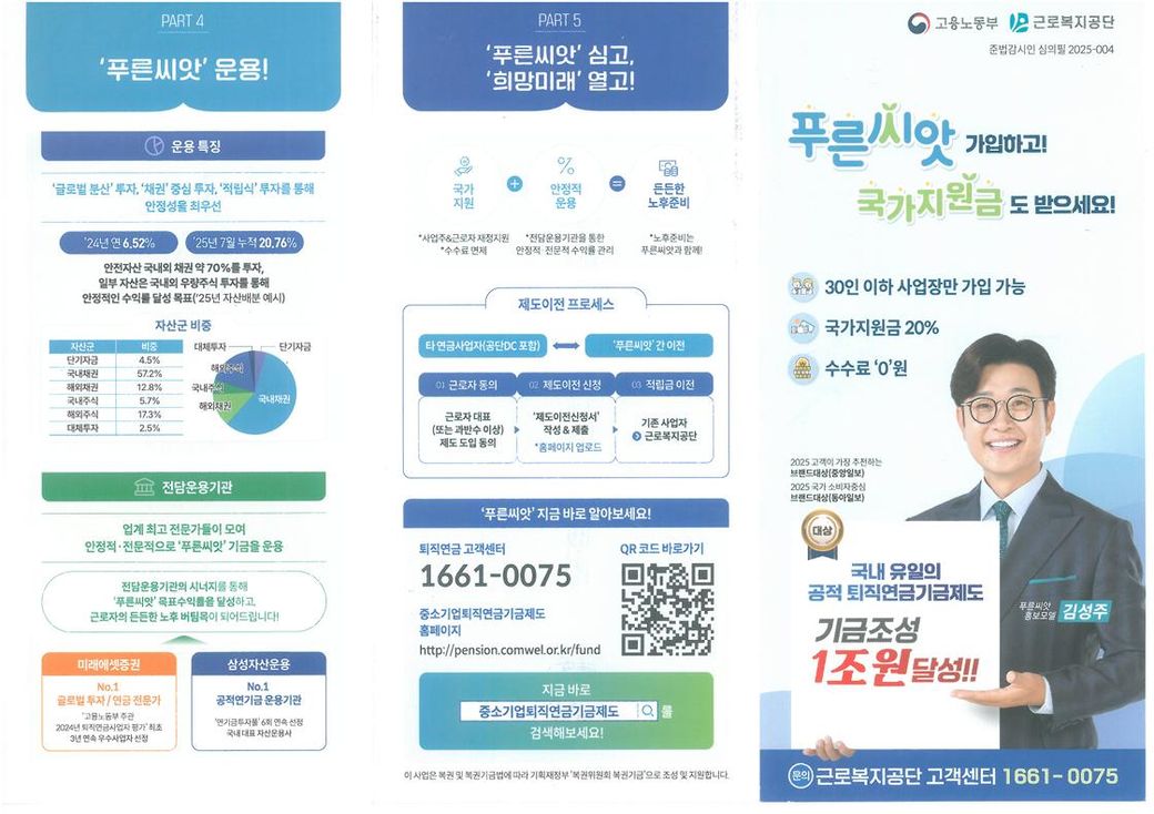 근로복지공단의 '푸른씨앗'은 중소기업 퇴직연금기금제도의 일환으로, 중소기업 근로자들의 퇴직급여를 각각은 소액이더라도 이를 한데 모아 규모를 키워 투자하는 방식으로 운영됩니다. 푸른씨앗으로의 전환을 고려하신다면, 원금보장형에서 투자형 상품으로의 전환을 의미하는데, 중소기업 근로자들을 위한 상품이기에 안정성과 수익성을 동시에 고려하여 운용될 것으로 보입니다. 안정적이면서도 어느 정도 수익률을 추구하는 상품을 고려하신다면 좋은 대안이 될 수 있습니다.