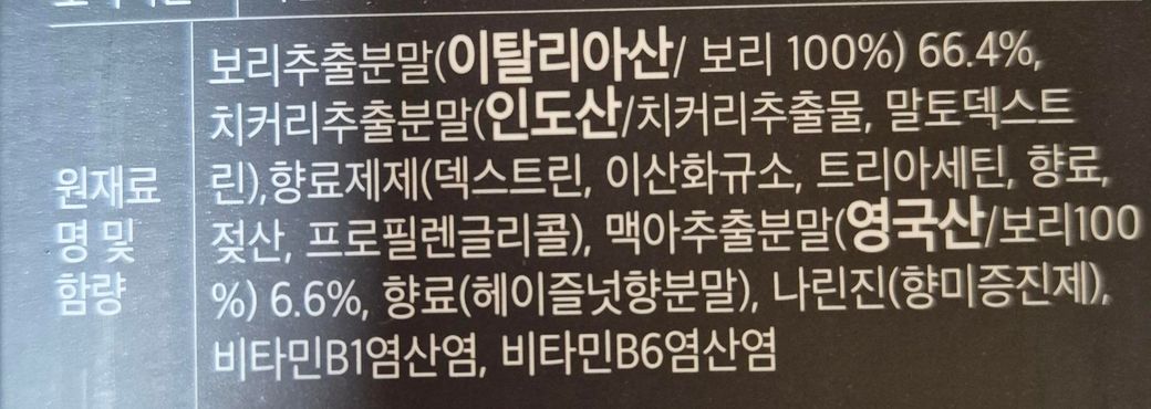 보리는 소화 증진과 식이섬유 공급에 유익하고, 치커리는 프리바이오틱스 역할을 하는 이눌린이 많아서 장 건강에 좋습니다. 그러나 가공 과정에서 포함된 말토덱스트린, 이산화규소, 프로필렌글리콜, 트리아세틴은 향료를 안정화하거나 가루 뭉침을 방지하기 위한 식품 첨가물입니다. 물론 식약처 승인을 받은 안전한 성분들이나 영양적 이점은 없고, 말토덱스트린은 당지수(GI)가 높아서 혈당 변화에 민감하신 분들은 과다 섭취를 주의해주셔야 합니다. 쓴맛이 나는 나린진, 보충된 비타민B군은 영양 보충 면에서 좋지만, 인공 향료와 복합첨가물이 포함된 가공식품이긴 합니다.