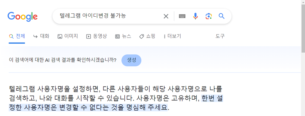 텔레그램 특성을 보니 한번 설정한 아이디는 변경이 불가능하다는 말을 들었습니다.