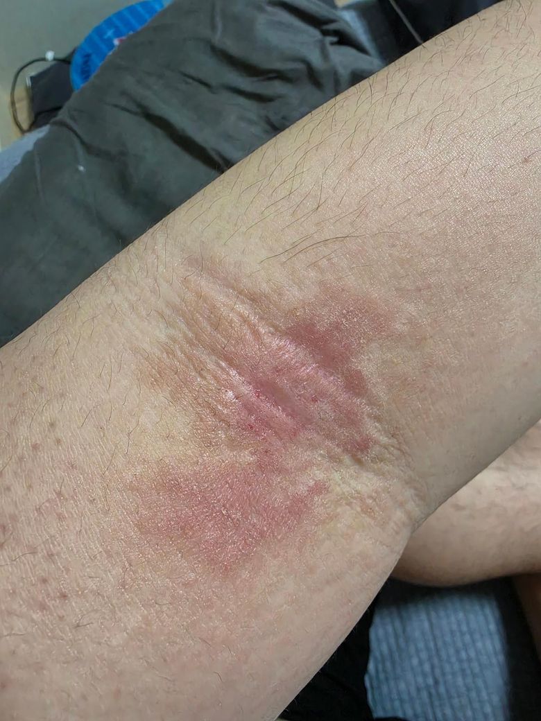 사진상 병변은 단순 땀띠보다는 만성 염증성 피부질환 양상에 더 가깝습니다. 특히 팔 접히는 부위(굴측)에 발생했고, 홍반 위에 두꺼워진 피부(태선화), 광택, 반복적 가려움과 긁은 흔적이 보입니다. 만졌을 때 따뜻한 느낌이 있는 점도 염증 활성도를 시사합니다.