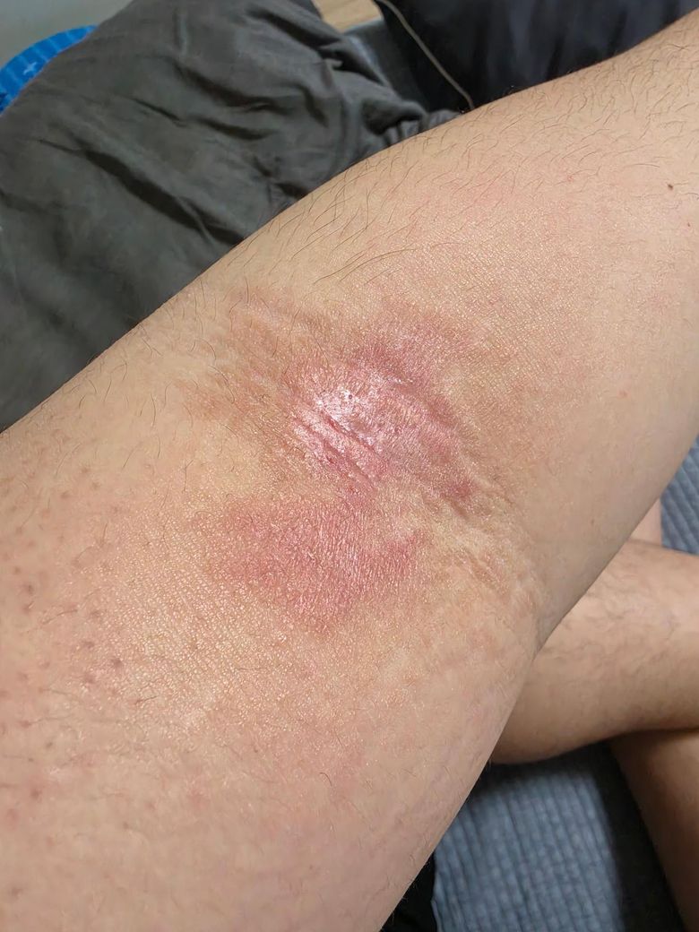 감별로는 진균 감염(피부사상균증)도 고려는 해야 합니다. 다만 진균은 경계가 더 뚜렷하고 가장자리 활성 병변 형태가 흔한데, 현재 사진은 전반적으로 균일한 염증 및 태선화가 중심이라 가능성은 상대적으로 낮아 보입니다.