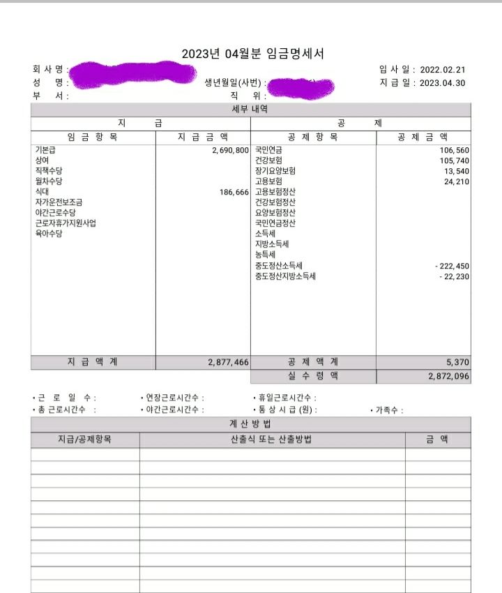 마지막 임금을 회사에서 지급해서 확인해보니 아래와 같습니다.