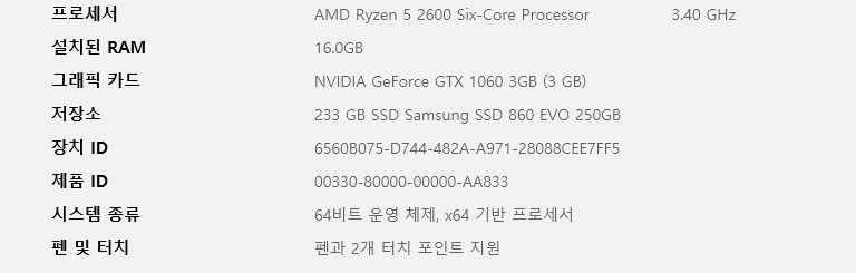 제가 사용하고 있는 컴퓨터 사양입니다. 요즘 컴퓨터가 느려져서 바꿔야 하나 고민중입니다.