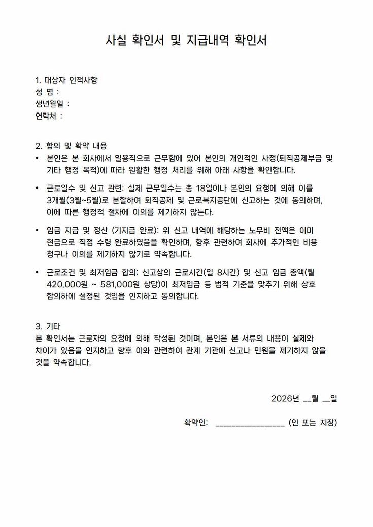 안녕하세요. 해당 건 내용 찾아보며 작성했는데 전문가가 아니다 보니... 혹시 이렇게 확약서 작성해도 법적 문제가 없을까요? 이미지 파일처럼 직원분께서 일용직 관련해 신고가 따로 들어가야 하는 상황인데 그렇게 하지 않으면 오히려 저희에화를 내시는 상황이라... 이대로 진행하면 될지 모르겠습니다...