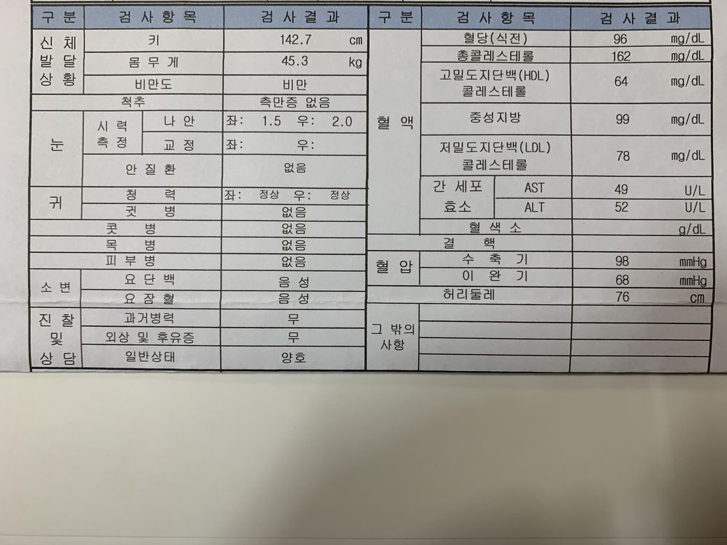 아이의 간수치가 정상치보다 약간 높은데 비만인 것으로 보아 지방간의 가능성을 배제할 수 없습니다. 공복혈당은 100 이상부터는 당뇨 전 단계, 126 이상 시 당뇨이므로 96이면 정상 범위지만 관리는 하는 것이 좋겠습니다. 혈압 등은 정상 범위이므로, 현재 당장 약물 치료를 할 정도의 결과는 아니지만 꾸준한 운동과 식이요법 등으로 체중을 관리하고 추후 간수치 검사는 추적관찰을 권고 드립니다.