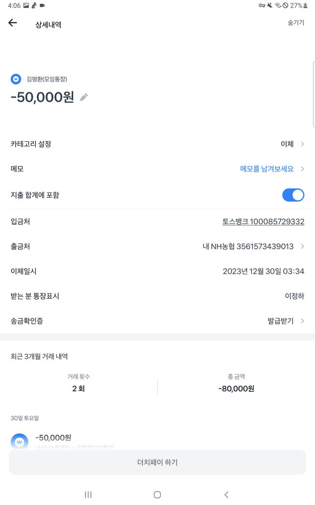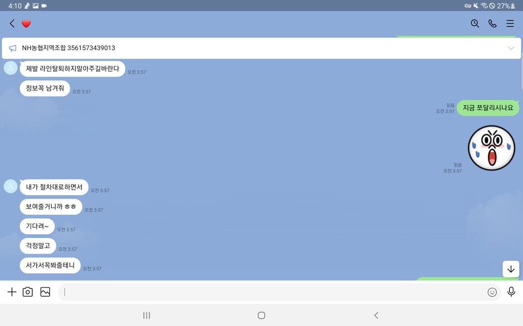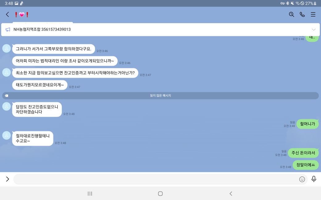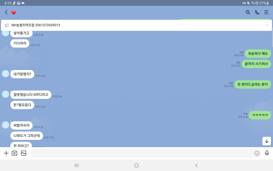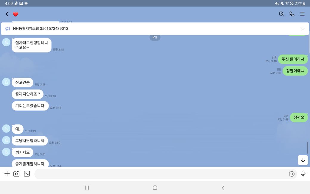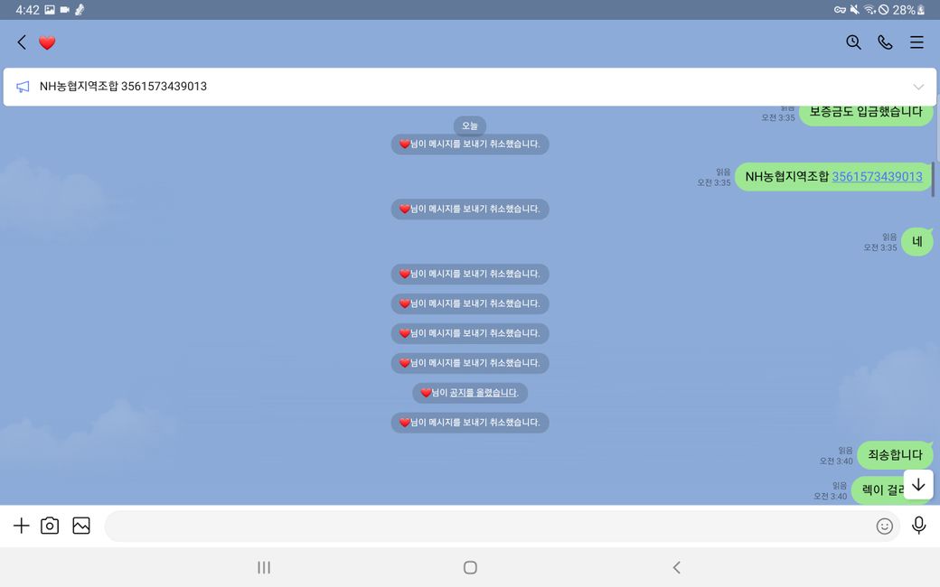 다음과 같이 입금도 완료했습니다.(그러나 판매자가 메세지 보내기 취소를 통해 이것이 자신의 계좌라는 증거를 지워버렸습니다.)