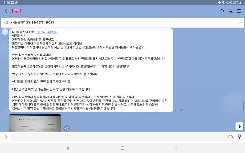 이후 판매자는 미성년자를 비롯해 N번방 사태를 들먹이며 신고를 했다는 사진과 함께 저에게 합의금 협박을 시작했습니다.