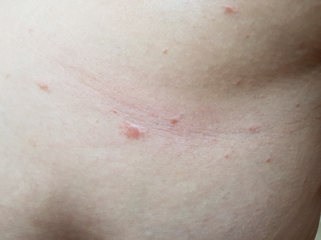 두드러기로 추정되는 병변입니다. 특정 음식을 섭취하거나 피부에 자극이 가면 팽진이 생기는 증상은 두드러기의 일종으로, 물집이 생기고 가려운 증상이 나타납니다. 두드러기는 여러 가지 원인에 의해 발생할 수 있는데, 가장 흔한 원인은 알레르기 반응입니다. 알레르기 반응은 특정 물질에 노출되었을 때 면역체계가 과민 반응을 일으켜 발생합니다.