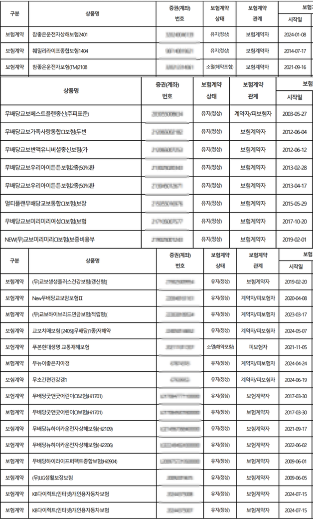 어머니께서 가입하신 보험들입니다.