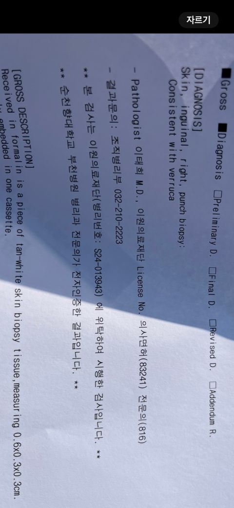 해당 사진상으로는 소견이 일부만 명시되어있고 잘린 내용으로 판단되어 정확한 확인이 불가능합니다. 사진 상으로도 사마귀에 해당된다는 내용만 확인이 됩니다. 아마 gross 내용 밑으로 추가되는 내용이 있을텐데 그 부분의 내용이 첨부되어야 하겠습니다.