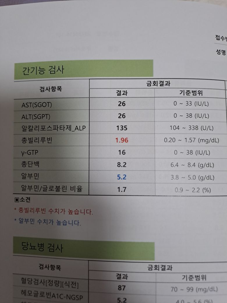 - 빌리루빈이 정상보다 약간 높으나 이는 일시적 탈수 현상의 일환일 수 있으며 감마지티피가 정상이어서 담도 질환의 가능성은 높아 보이지는 않습니다. 역시 추가적으로 재검사를 받아보시는 것이 좋겠습니다.
