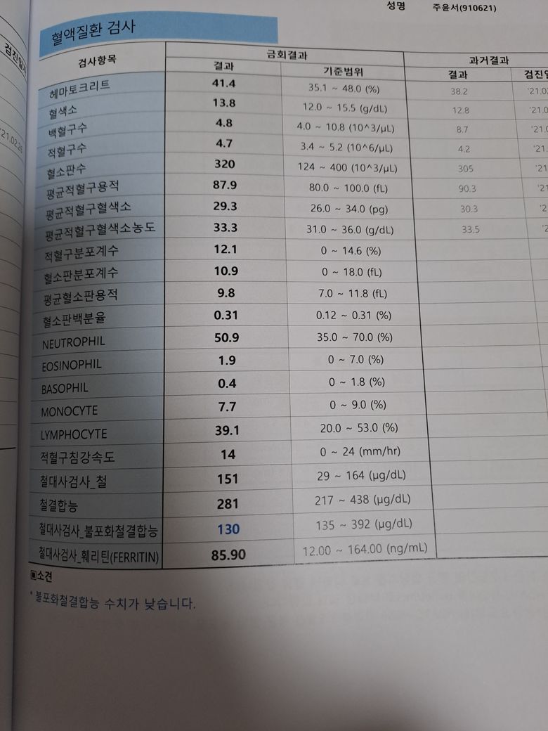 - 철결합능은 빈혈시에 빈혈의 여러 종류를 감별하는데 유용한 것으로 현재 빈혈이 없는 상태이며 정상에 근접하여 추후 재검사를 받아보시는 것이 좋겠습니다.