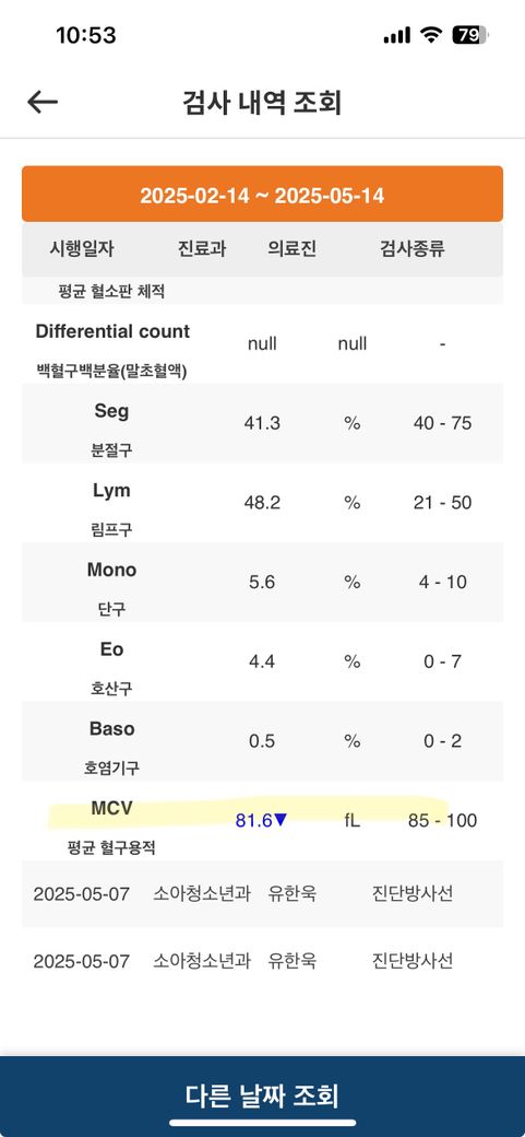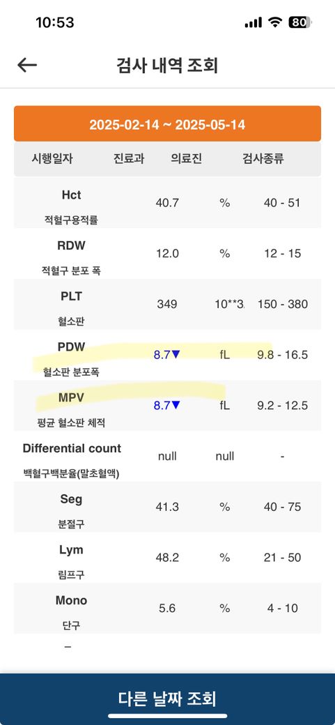 검사 수치상 MCV(81.6), MCHC(34.6), MPV(8.7)는 정상 범위에 가깝거나 경미한 차이이며, PDW(8.7)는 약간 낮은 편이지만 임상적으로 큰 문제를 의미하진 않을 수 있습니다. 전반적으로 빈혈이나 혈소판 이상 여부는 추가적인 검사나 아이의 증상 유무와 함께 평가해야 합니다. 정확한 해석은 전체 혈액검사 결과(CBC)와 아이의 건강 상태, 증상 유무를 함께 본 소아청소년과 전문의의 판단이 필요합니다