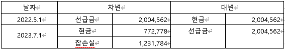 1.2022년 5월 직원경비로 선급금을 지급하고 2023년 7월 회수하는 과정에서 잡손실이 발생했습니다.