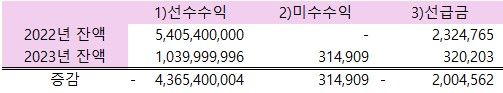 1.2022년 거래처B로부터 선수수익 20만불(2,405,400,000원) 을 받았습니다.