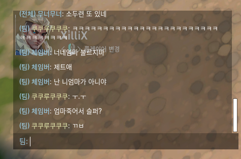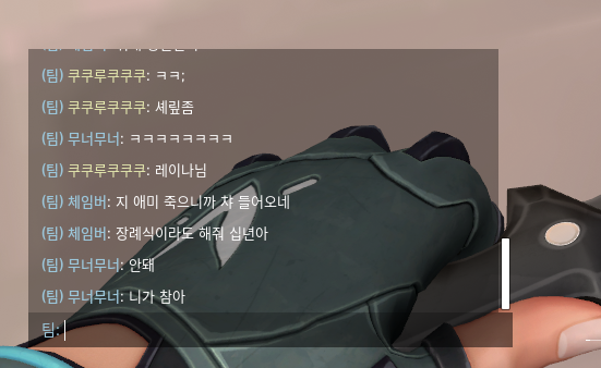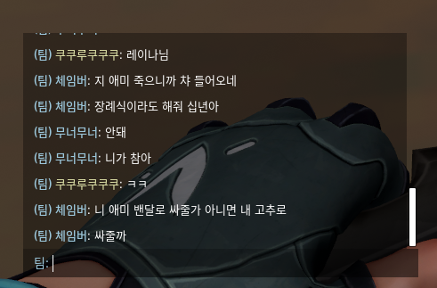 게임 상에서 팀원(5명)이 모두 볼 수 있는 채팅으로 패드립 및 성드립을 당했습니다. ("체임버"에게)