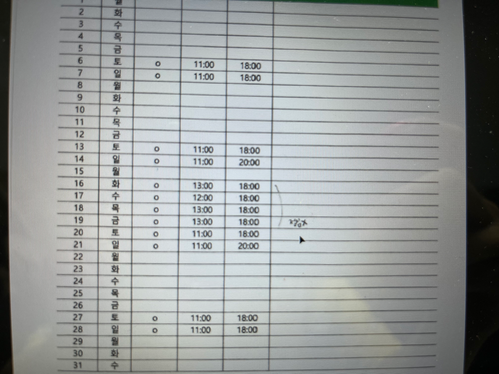 주휴수당은 1주간 소정근로시간이 15시간 이상인 근로자가 1주간 소정근로일을 개근한 때 청구할 수 있는바, 소정근로시간이란, 노사 당사자 사이에 근로하기로 정한 시간을 말하므로, 1일 7시간, 주말 2일 근로하기로 한 때는 1주 소정근로시간은 14시간으로서, 특정 주에 15시간 이상을 근로했더라도 주휴수당을 지급하지 않아도 됩니다. 따라서 상기 근무표에 의하면 토/일요일을 초과하여 근로하였으므로 연장근로수당을 지급해야 하나, 주휴수당은 지급하지 않아도 됩니다.