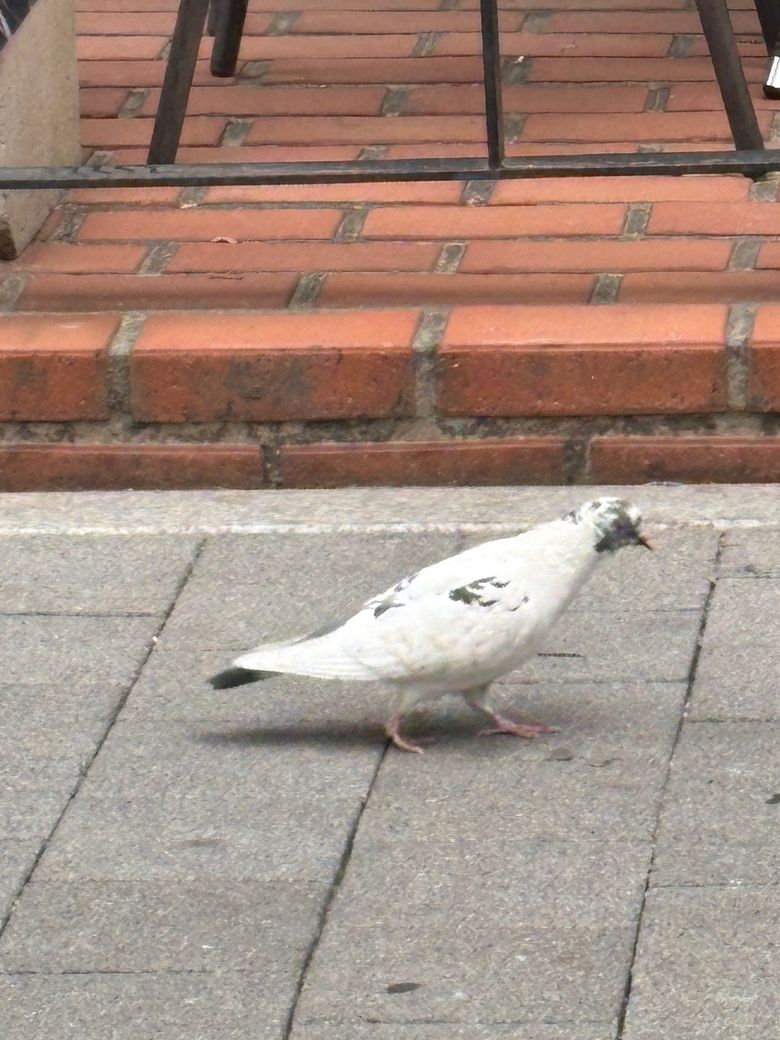 또 하나는 알비노처럼 보일 수도 있지만 사진만 보면 그쪽보다는 그냥 색 변이가 생긴 비둘기일 가능성이 더 커요. 알비노는 눈 색이나 전체 색이 더 특징적으로 보이는 편인데 이 새는 검은 무늬가 남아 있어서 보통은 부분적으로 색이 옅어진 개체로 보는 편이 자연스러워요.