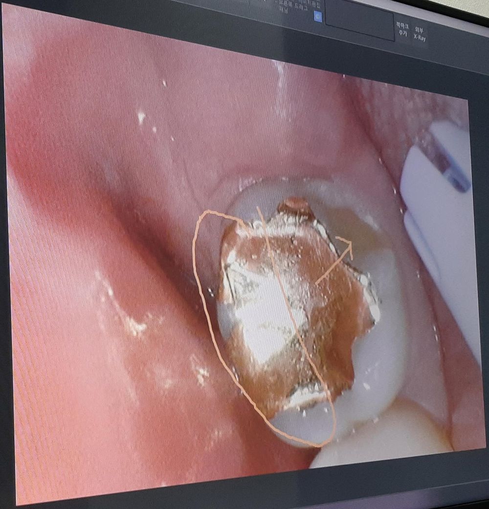그런데 C 치과에서는 2023년에 씹을 때 힘을 받는 부위가 바깥쪽(멀쩡한 부분)이니 안쪽(부서진 부분)은 괜찮다고 하셔서 그 뒤로 딱히 치료는 안 하고 있습니다. (이 사진의 골드 인레이는 2019년 4월에 했으며 그 뒤로 약 7년동안 씹을때 아프다거나 하는 건 못 느꼈습니다.)