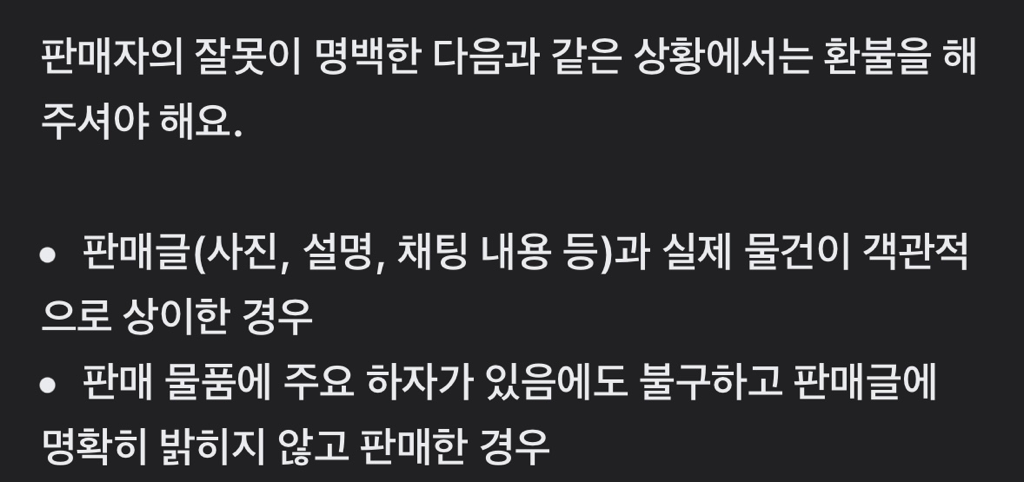 제가 답답한것은 중고사이트에서 제 요점을 파악을 못했다는것입니다. 저는 냄새가 심하고 약하고 냄새의 정도가 중요한게 아닙니다. 냄새에 대한 하자는 주관적인거 저도 인정하는 부분이구요. 제가 구입한 오븐에서 냄새가 절대 났으면 안됐다라고 주장하는것도 아닙니다. 제가 말하고 싶은건 처음부터 베이킹용이라고 판매자에게 말을 했으면 판매자는 이미 그 사실을 알고 있었고 그러면 (저에게 팔기 하루전날 자기가 생선을 구워서 생선냄새가 배인걸 자기도 알고 있었구요) 저에게 생선냄새가 난다고 설사 그게 생선냄새가 아닌 어떠한 다른냄새일지라도요,냄새가 난다고 저한테 사전고지를 해줘야하는게 의무아닌가요? 저는 아무것도 모른채 구매를 했고 환불을 해달라하니 작동이 안되는거도 아닌데 환불못해준다하니 어떻게 해결할 방법이 없습니다. 하지만 전 분명 오븐의 용도가 베이킹용이라 말했고 냄새라는 요인은 저한테 중요사항이 되는거고 주요하자가 될 수 밖에 없습니다. 중고사이트에 아래처럼 적혀있는데 두번째 사유에 분명 해당하는거 아닌가요?이런경우 제가 환불받을수 없는건가요. 객관적으로 말씀 부탁드립니다.