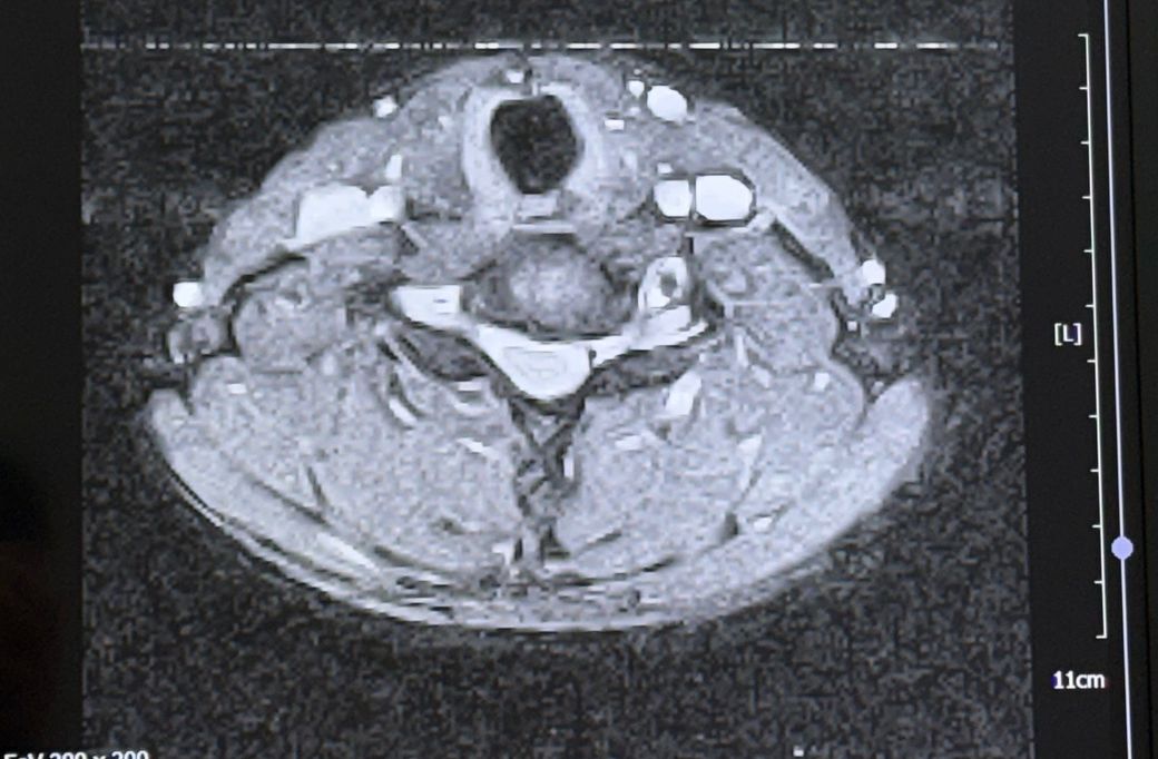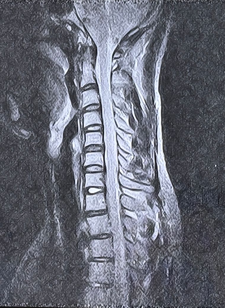 제공해주신 영상은 경추 MRI로 보이며, 전반적인 정렬은 유지되고 있고 C6–7에서 후방으로 디스크가 돌출된 소견은 확인됩니다. 다만 단일 컷 이미지로는 신경공 협착 정도나 신경근 압박의 정확한 정도를 정량적으로 판단하기는 제한이 있습니다. 척수 자체의 신호 변화는 뚜렷하게 보이지 않아 중증 척수병증 가능성은 낮아 보입니다.