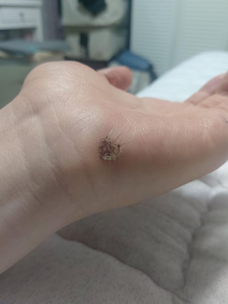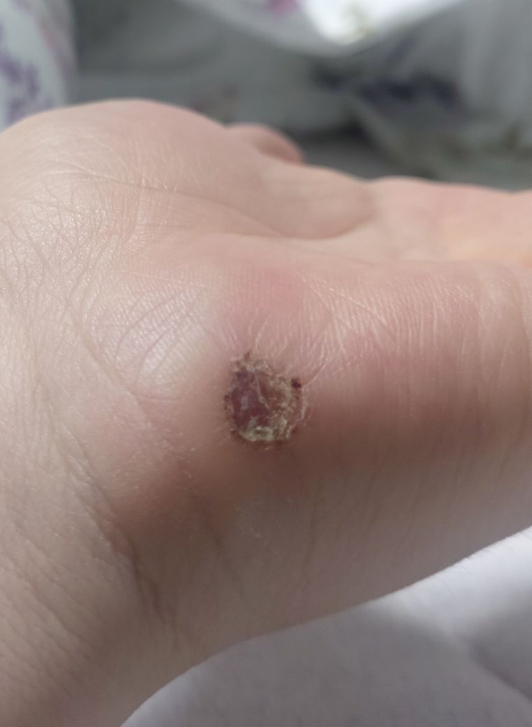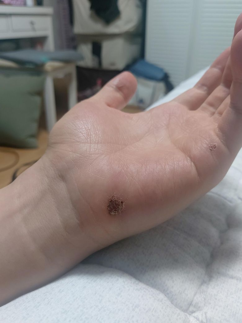 눌렀을 때 주변 부위가 약간 아프고, 딱지 자체가 주변 부위보다 움푹 들어간 느낌입니다.
