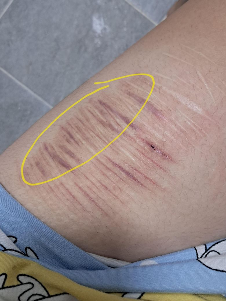 상처 주변이 연갈색인데 왜 이러죠? 상처와 연관이 있는 걸까요? 오른쪽 빨간 건 긁어서 생긴 겁니다 · · · · · · · · · · · · · ·