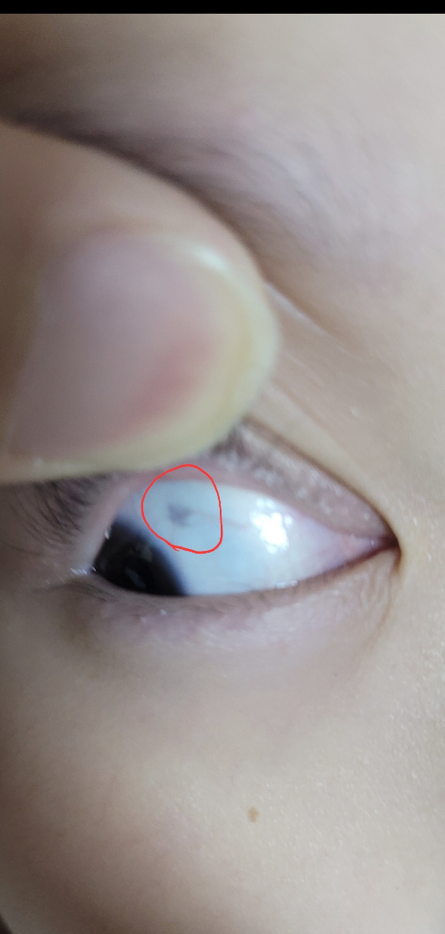 결막모반이 있는 것으로 보입니다. 결막모반은 피부에 생기는 점이 안구에 생겼다고 생각하시면 되고, 미용적으로 신경쓰일 수 있지만 따로 치료를 요하는 질병은 아닙니다.
