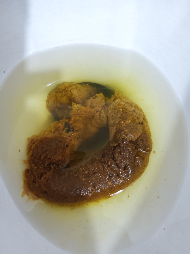 음식물의 종류에 따라서 변의 색깔이 조금 달라 보일 수는 있어요. 변 자체는 전혀 문제가 없는 상태라고 생각되네요.