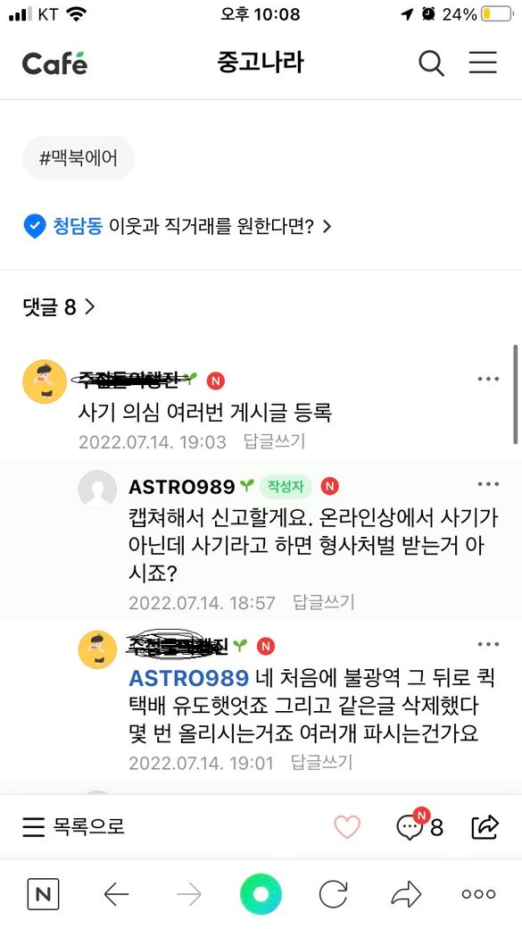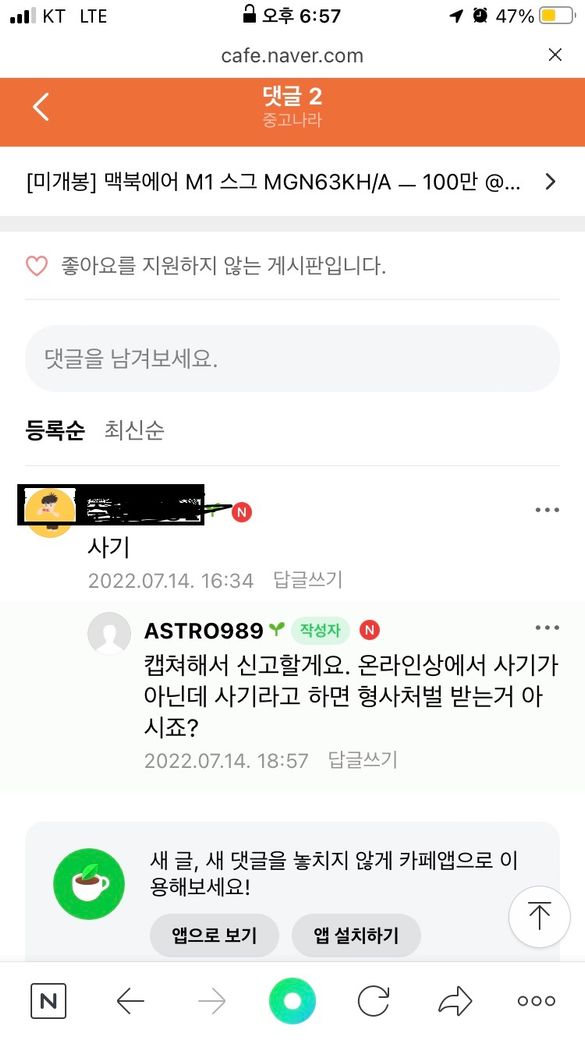 중고나라에서 사기 라고 주장하는 사용자 처벌건