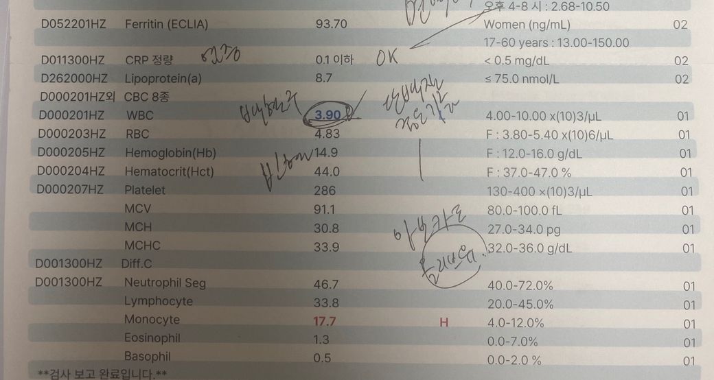 백혈구 수치가 낮긴하지만 신경쓸 정도가 아니랬고, 단핵구 수치는 어떤 설명을 듣지 못했는데 와서 보니 매우 높은거 같아 걱정이 됩니다.