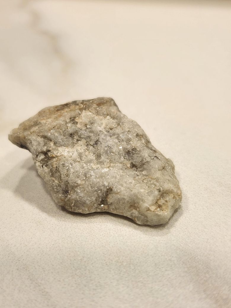 사진으로 보기에는 석영이 주성분이 규암으로 보입니다. 규암은 사암이 변성작용을 받아 만들어진 변성암입니다. 아주 작게 반짝이는 물질은 백운모로 보입니다.