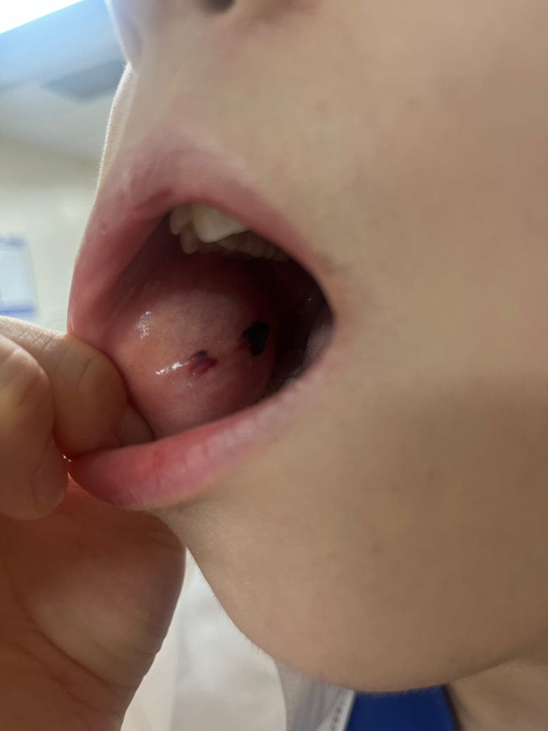 혈종으로 보입니다. 잇몸을 자는동안에 잘못 씹어서 생겼을 가능성이 높으며 사라지지않는다면 치과에 가보시는게 좋겠습니다