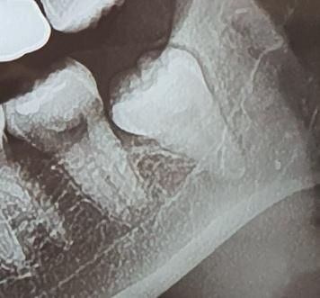 저정도 깊이라면 일단 CT를 찍어보셔야될것같습니다. 엑스레이 상으로는 신경관과는 닿아 잇진 않고 신경관 옆으로 치아가 위치한거 같습니다.