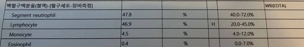 오늘 결과가 나왔는데, Lymphocyte부분에서만 H가 나왔습니다..! 혹시 문제가 되는 사항인지.. 정상수치로 가기 위해서 어떤 관리를 해야하는지 궁금합니다..!
