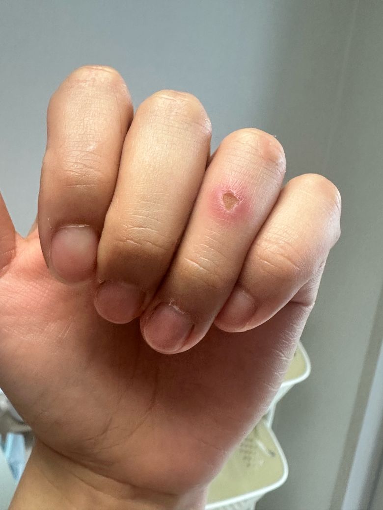 손가락 끝에 작은 상처가 생기셨고 딱지가 있는 것으로 보이며 상처 주변에 약하게 붉은 염증 반응이 보이며 열감이 없다면 큰 문제는 아닐 것으로 생각되며 상처부위 깨긋하게 세척 잘해주시고 소독 및 연고 바르고 하시면 큰 문제는 없을 것으로 생각됩니다.