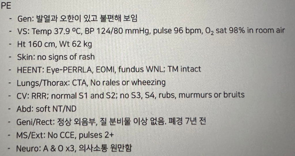 2형당뇨, 10일전 요절박,빈뇨,구역 요통,오한,체온증가(38도),요로감염1년내