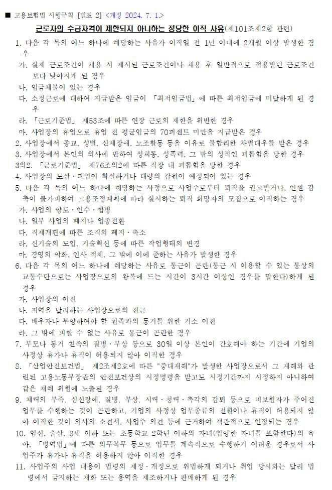 고용보험법 시행규칙 제101조제2항 별표2에서는 구직급여 수급자격이 인정되는 정당한 이직사유를 규정하고 있는 바, 이를 참고하시기 바랍니다.