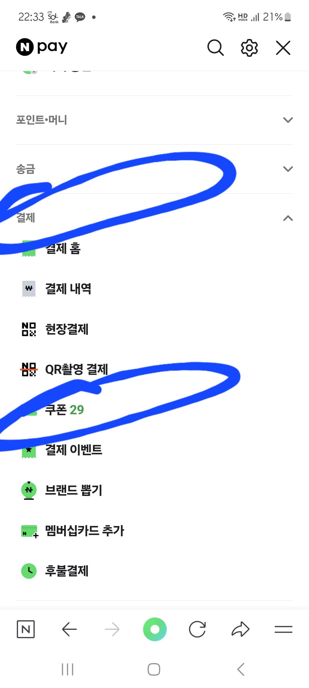 그거 누르시고요 이후 아래 사진처럼 결제를 눌너보시면 메뉴 쭉 뜨는데 거기서 '쿠폰'을 누르셔요.