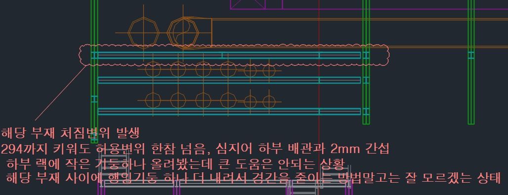 사진에 표시해둔 부재가 허용수직변위를 상당히 넘어가서 부재를 키워야하는 상황인데 부재를 키우면 하부 배관과 간섭이 생겨서 이걸 우째 해야할지 잘 모르겠습니다