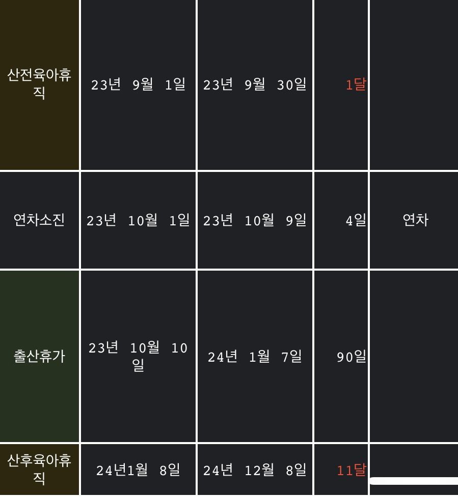 산전육아휴직(출산휴가) 9/30까지 1달 하고, 10/1부터 연차 소진하였는데