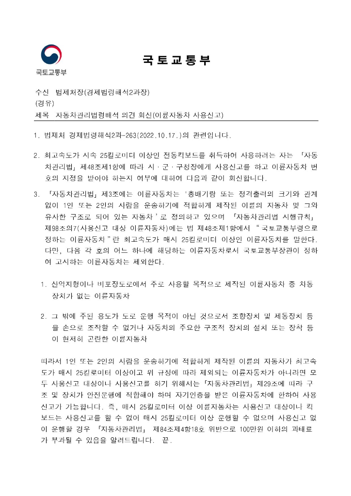 전동킥보드 역시 자동차관리법상 이륜자동차로서 해당 법의 적용을 받는 것은 맞으나, 현행법상 최고속도가 25km이므로 25km이상을 초과할 수 없겠으며, 따라서 신고대상이 되는 전동퀵보드는 예상하기 어렵습니다. 만약 25km이상을 초과하는 전동퀵보드가 있으면 신고대상이 될 것이나, 불법이므로 신고가 불가능할 것이므로 자동차관리법 위 규정에 따라서도 처벌대상이 될 수 있습니다.