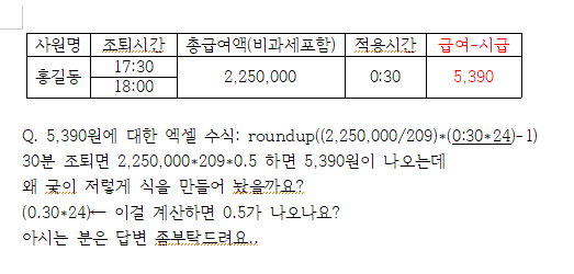 Q. 5,390원에 대한 엑셀 수식: roundup((2,250,000/209)*(0:30*24)-1)